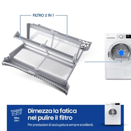Uno dei punti di forza dell’asciugatrice Samsung Crystal EcoDry è la sua connettività Wi-Fi, che permette di controllare e monitorare il ciclo di asciugatura direttamente dal proprio smartphone tramite l’app SmartThings. Questa funzionalità consente anche di ricevere suggerimenti personalizzati per i programmi da utilizzare, notifiche di manutenzione e aggiornamenti software per migliorare le performance del dispositivo. Inoltre, la manutenzione è facilitata dal sistema 2-in-1 del filtro, che integra due livelli di filtrazione in un’unica struttura, rendendo più semplice la pulizia e migliorando l’efficienza della macchina. L’indicatore di pulizia del filtro e del condensatore avvisa l’utente quando è necessario intervenire, garantendo così una maggiore longevità dell’apparecchio.