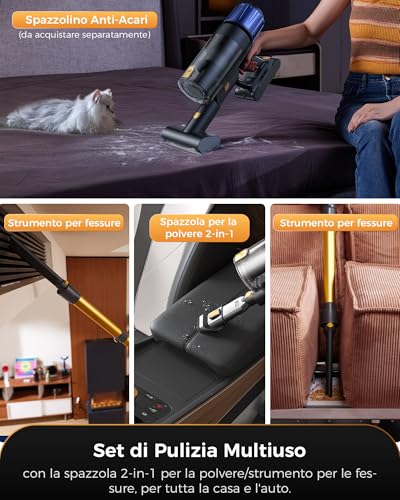 Incluso nella confezione, il Proscenic P15 viene fornito con un’ampia gamma di accessori multifunzione: spazzola motorizzata per tappeti, bocchetta per fessure, spazzola 2 in 1 e mini spazzola motorizzata per peli di animali. Questi strumenti permettono una pulizia completa in ogni angolo della casa, dall’auto agli imbottiti, fino agli angoli più nascosti. La trasformazione in aspirapolvere portatile avviene con un semplice gesto, garantendo massima versatilità. Inoltre, la modalità silenziosa consente l’utilizzo anche in orari serali, senza disturbare. Ogni accessorio si monta facilmente e si ripone in modo ordinato grazie alla base di ricarica integrata.