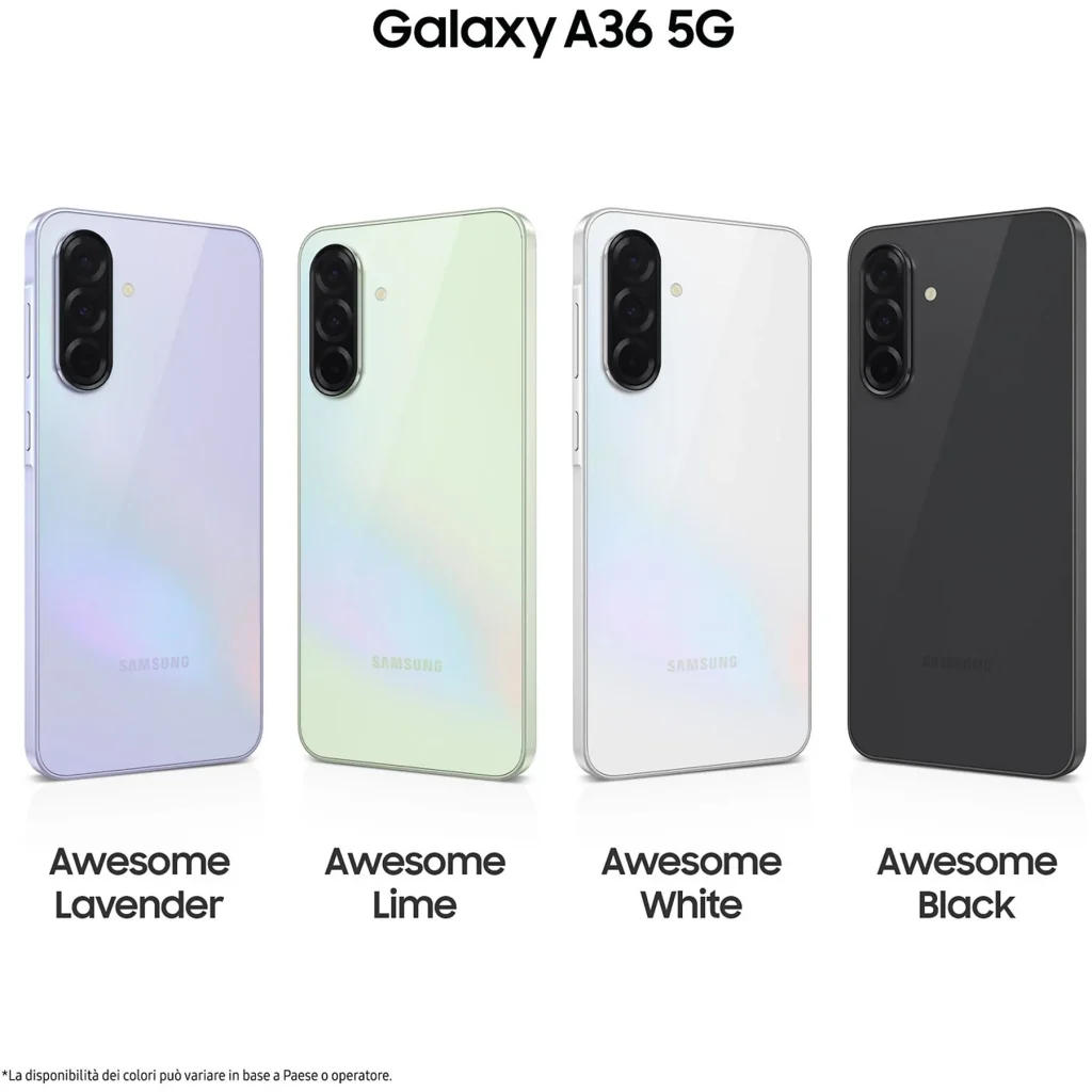 In termini di colorazioni, Samsung offre il Galaxy A36 in Lavender, Black, White e Lime, tutte con una finitura lucida che enfatizza il design premium del dispositivo.