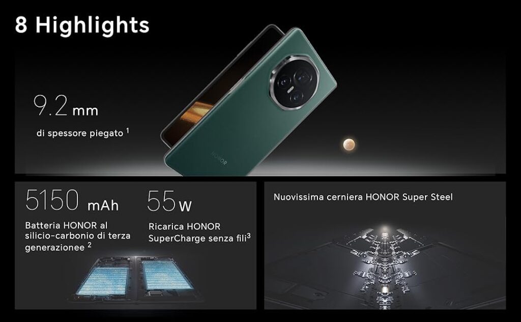 L’HONOR Magic V3 rappresenta un punto di riferimento nel mercato degli smartphone foldable, grazie al perfetto equilibrio tra design, prestazioni e innovazione. Con il suo profilo ultra-sottile, un comparto hardware di alto livello e un software ottimizzato per il multitasking, si posiziona come un dispositivo premium capace di soddisfare sia le esigenze di produttività che di intrattenimento.