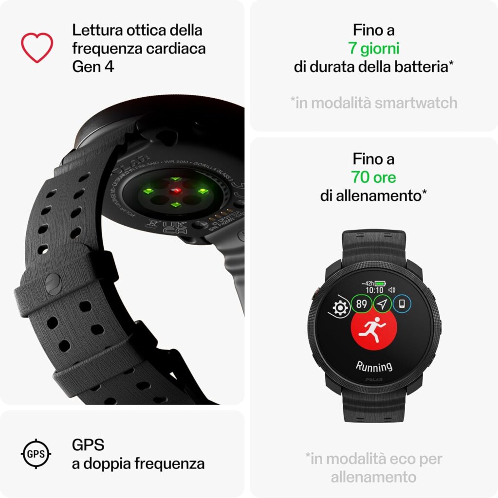 Tra i suoi punti forti c’è la tecnologia Polar Elixir, che monitora frequenza cardiaca, SpO2, temperatura cutanea e perfino l’ECG, tutto dal polso. Un vero concentrato di dati per chi vuole tenere sotto controllo le proprie condizioni fisiche in tempo reale.