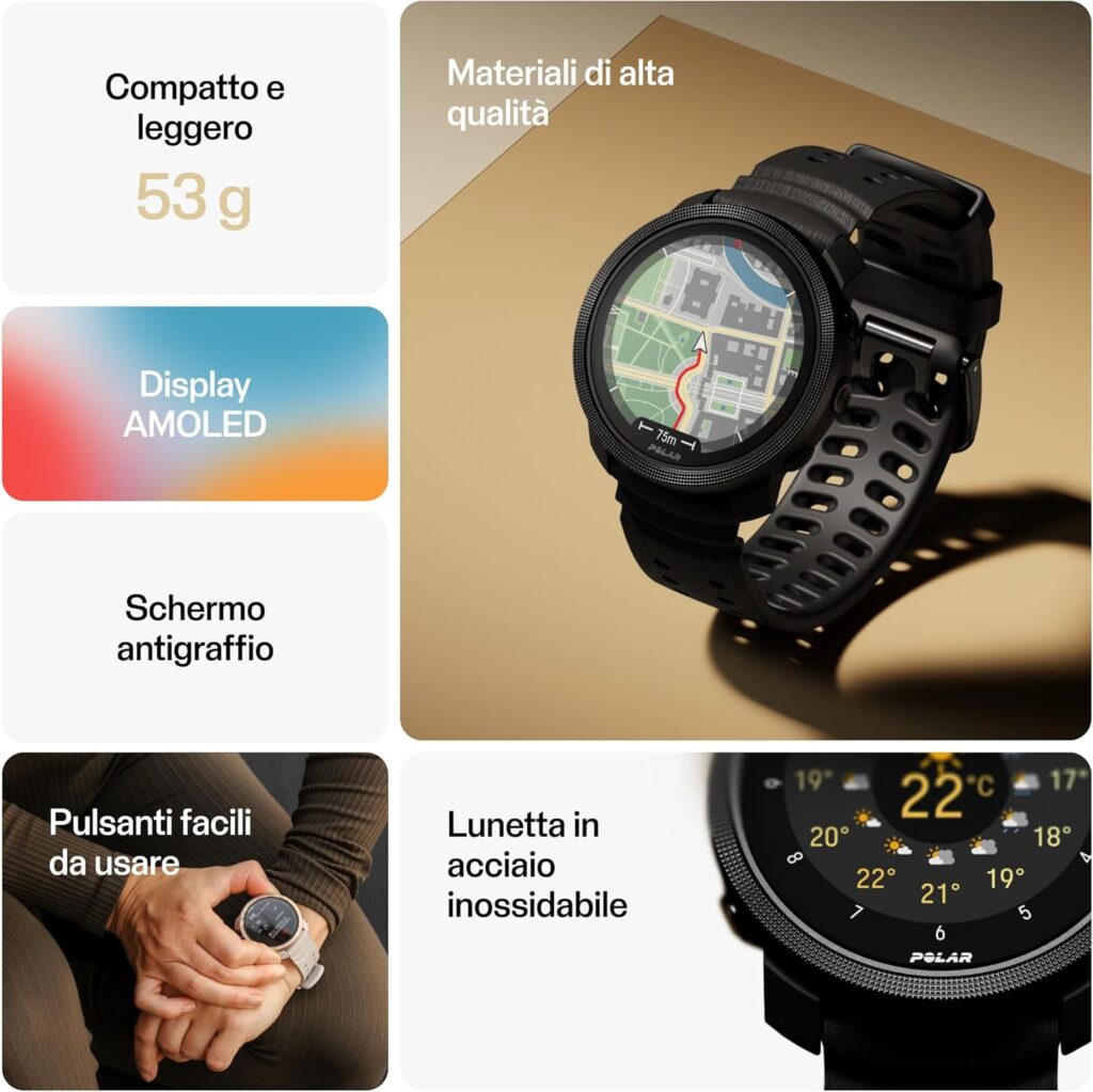Il Polar Vantage M3 colpisce immediatamente per il suo design raffinato, pensato per chi cerca uno sportwatch che sia tanto funzionale quanto esteticamente piacevole. Con un peso di soli 53 grammi, questo dispositivo multisport si distingue per la sua estrema leggerezza, che lo rende quasi impercettibile al polso, anche durante gli allenamenti più lunghi e intensi.