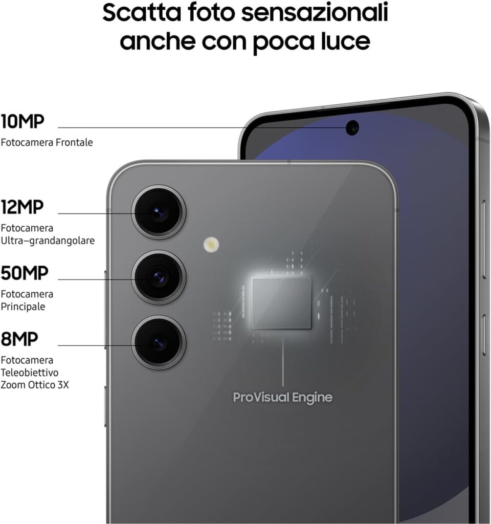 Il Samsung Galaxy S24 FE offre un comparto fotografico ben bilanciato, con una tripla fotocamera posteriore: un sensore principale da 50 MP, un ultra-wide da 12 MP, e un teleobiettivo da 8 MP. Questa configurazione permette di ottenere scatti versatili in diverse situazioni, garantendo buoni dettagli e colori naturali. La presenza del teleobiettivo lo distingue da altri modelli della stessa fascia, consentendo zoom ottico senza perdita di qualità. Inoltre, l’integrazione delle funzionalità AI migliora l’elaborazione delle immagini, rendendo più semplice ottenere foto ben bilanciate anche per i meno esperti.