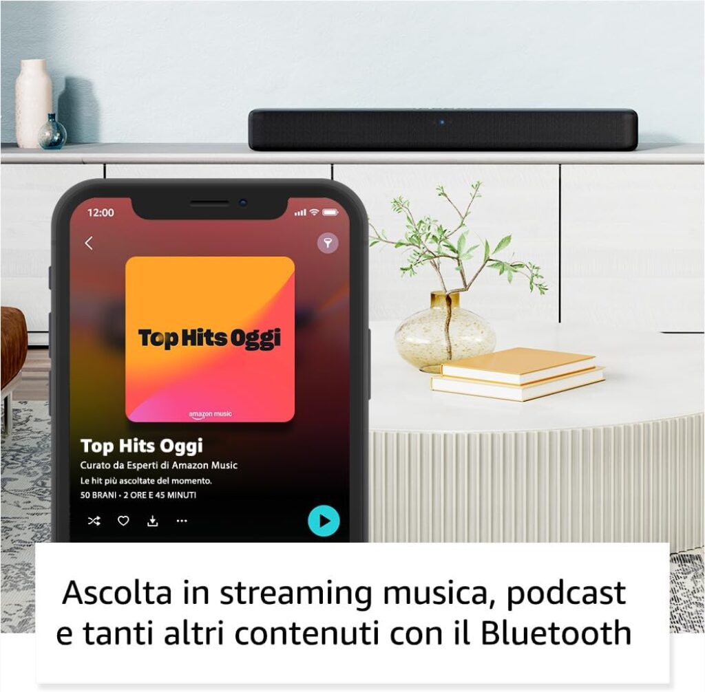 Non solo film e serie TV: grazie al Bluetooth, questa soundbar diventa anche uno speaker perfetto per ascoltare musica, trasformando il tuo salotto in uno spazio dinamico e sonoro, ogni volta che lo desideri. E se sei già parte dell’universo Fire TV, troverai un’integrazione impeccabile che ti permette di gestire tutto con un solo telecomando, semplificando ogni interazione.