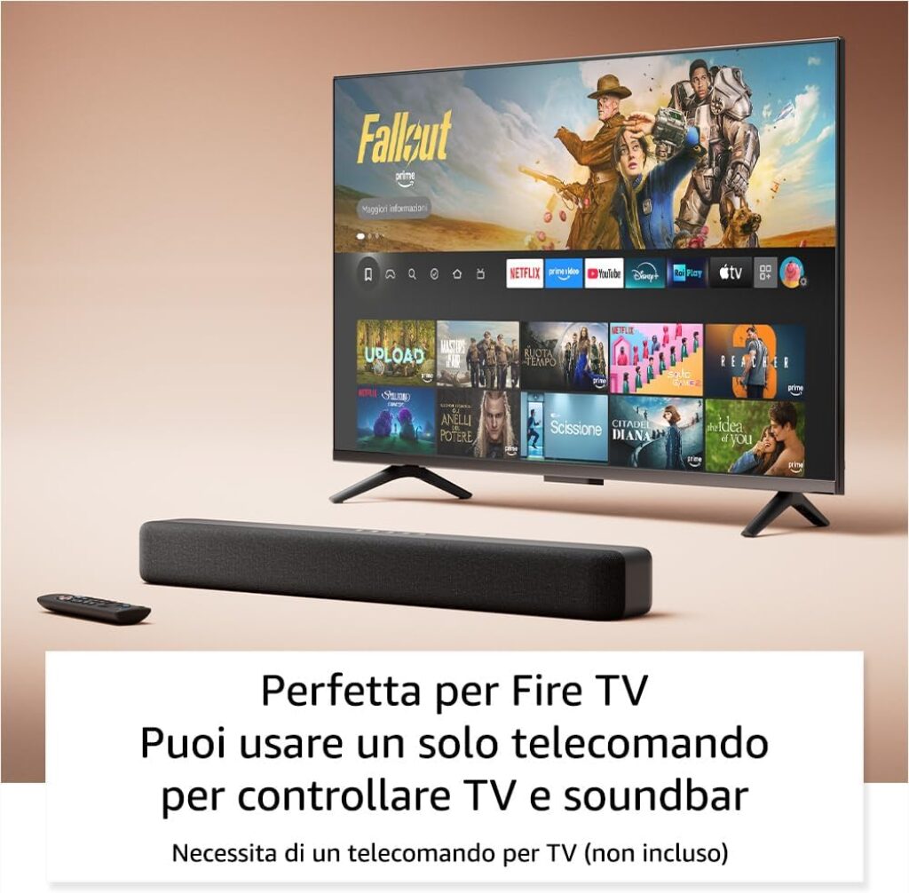 Dotata delle tecnologie DTS Virtual:X e Dolby Audio, questa soundbar è pensata per trasformare ogni contenuto multimediale – dai film ai videogiochi – in un momento immersivo, con dialoghi chiari, bassi profondi e una resa spaziale tridimensionale che fa dimenticare di essere nel salotto di casa. Inoltre, la sua perfetta integrazione con l’ecosistema Fire TV rende l’esperienza ancora più fluida, permettendoti di controllare tutto con un solo telecomando.