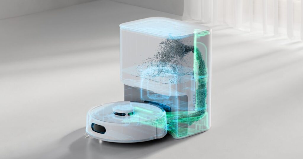 Inoltre, il design della stazione di svuotamento è pensato per ridurre il rumore, rendendo il processo di svuotamento discreto e non disturbante. Questo è particolarmente utile se il robot è programmato per pulire durante le ore notturne o quando ci si trova a casa. La base funge anche da punto di ricarica, assicurando che il robot sia sempre pronto all’uso.
